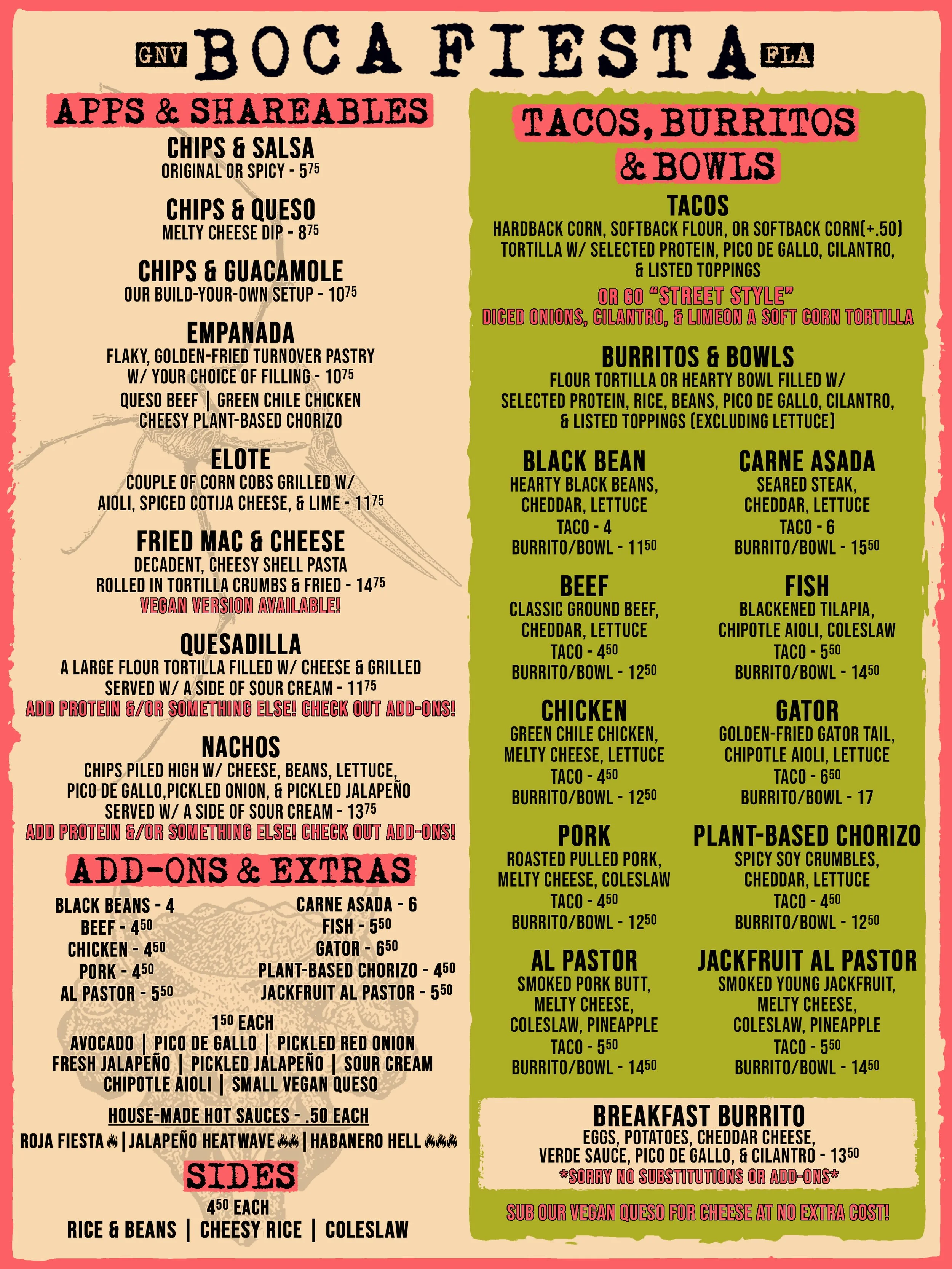 HELLO AND WELCOME IN TO BOCA FIESTA! HERE IS OUR MENU AND ALSO SOME SEASONAL SPECIALS TO CHECK OUT!